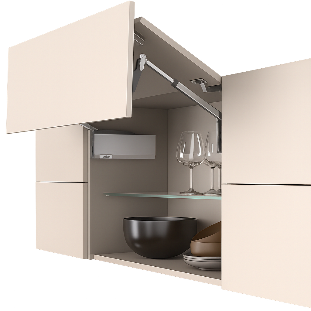 Výklopné kování Blum AVENTOS HF je určeno pro vysoké horní skříňky se skládanými (dvoudílnými) čely. Umožňuje pohodlné otevírání dvířek nahoru ve dvou částech, přičemž výklop zůstane otevřený v jakékoli pozici. Díky integrovanému tlumení BLUMOTION se zavírá tiše a plynule. Kompatibilní s elektrickým pohonem SERVO-DRIVE. TIP-ON u tohoto typu výklopu nelze použít. Ideální pro kuchyně i obytné prostory s vysokými skříňkami.