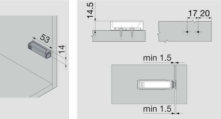 - Pro optimální komfort pohybu dvířek je vhodné TIP-ON kombinovat s osvědčeným závěsem CLIP top bez pružiny (dlouhá verze s dorazem se hodí i pro závěsy s pružinou).