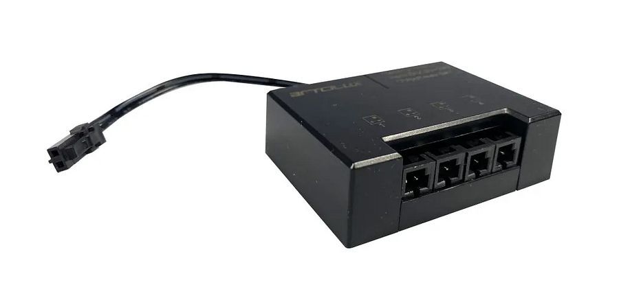 Svorkovnice s bezdrátovým přijímačem pro ovládání LED osvětlení připojených prostřednictvím AMP konektorů.
