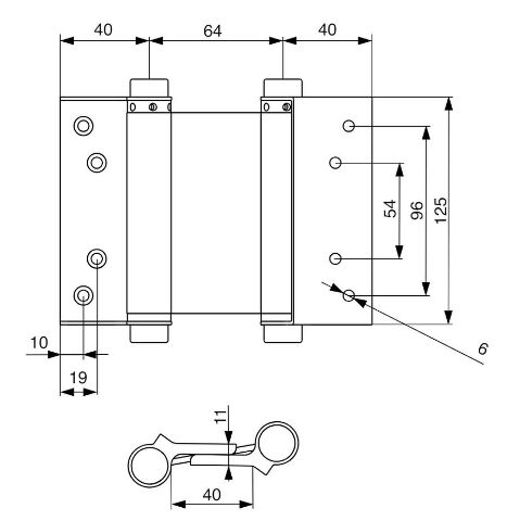 Oboustranný pružinový závěs pro lítačkové dveře.