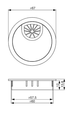 Kulatá kovová kabelová průchodka sloužící k protažení kabelů deskou pracovního stolu.