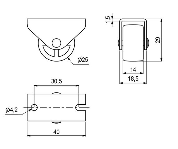 Nábytkové kolečko pevné pro skříňky jezdící na měkčím povrchu (bez měkčeného běhounu).
