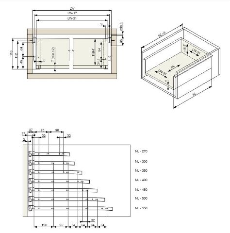 - sada pro sestavení zásuvky s plechovými bočnicemi a kolečkovými výsuvy