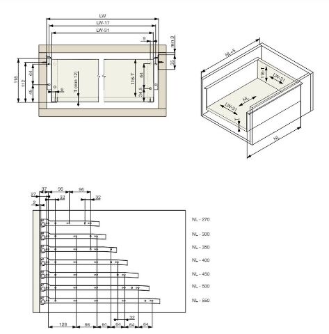 - sada pro sestavení zásuvky s plechovými bočnicemi a kolečkovými výsuvy