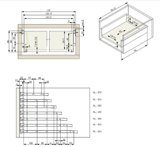 - sada pro sestavení zásuvky s plechovými bočnicemi a kolečkovými výsuvy