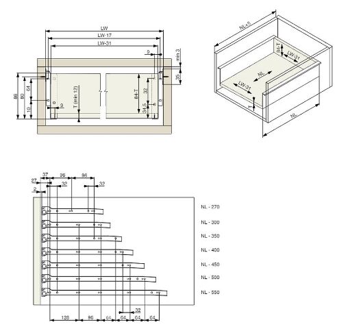 - sada pro sestavení zásuvky s plechovými bočnicemi a kolečkovými výsuvy