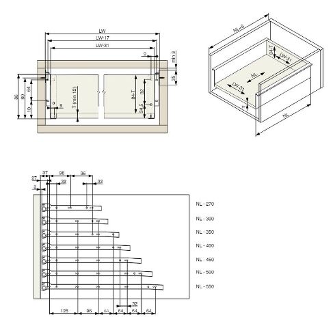 - sada pro sestavení zásuvky s plechovými bočnicemi a kolečkovými výsuvy