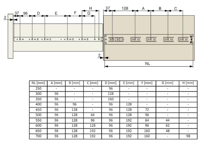 - délka vysunutí výsuvu je stejná, jako jeho nominální délka - jedná se tedy o celovýsuv