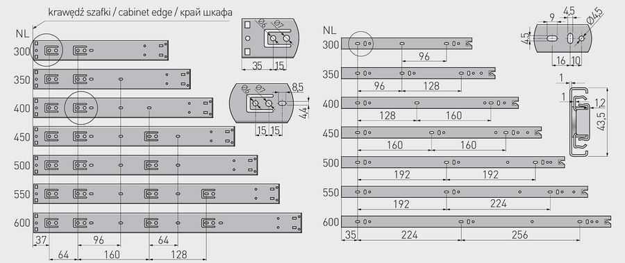 - kuličkový výsuv o výšce 43,5mm pro celodřevěné zásuvky