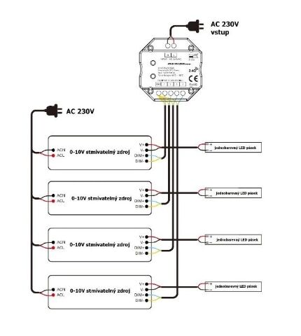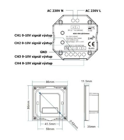 Čtyřkanálový LED ovladač pro jednobarevné osvětlení, dálkové RF (radiofrekvenční) ovládání, 0-10V, 1-10V