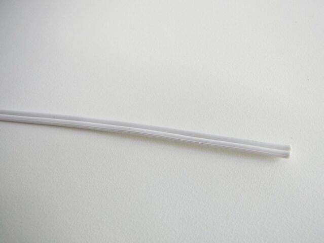 Dvoužilový plochý vodič s laněným měděným jádrem. Izolace je z bílého PVC a jedna z žil je označena podélným vroubkováním.