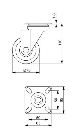 Kolečko nábytkové 75mm, plotnička 65x65 mm, šedá