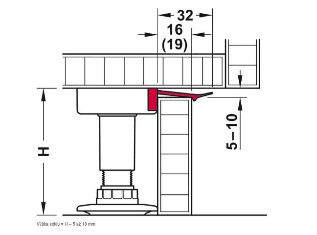 Funguje pomocí plastové pružinky, která se nackvakne do příruby nohy a plastová pružinka se opře o sokl a zamezí spadnutí soklu.