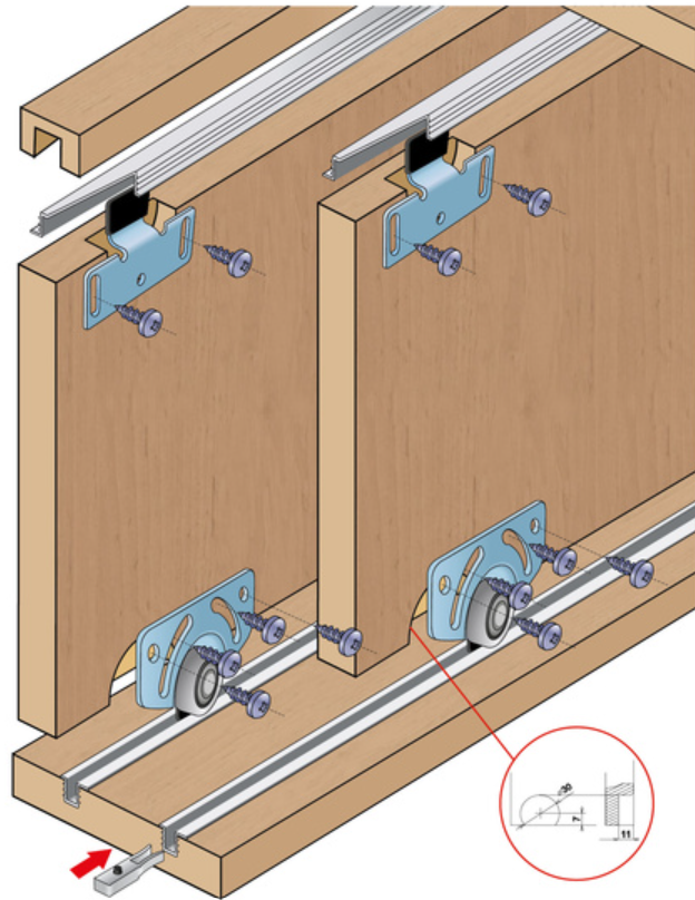 Kování pro posuvné dveře S35 se vyznačuje jednoduchou montáží, seřízením a nízkou cenou.  Hmotnost dveří 35 kg tloušťka dveří min. 18 mm. Spodní vedení.