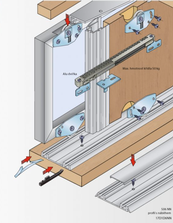 Kování S50N je určeno pro šatní skříně, kde je jako materiál použito lamino, masiv případně hliníková dvířka. Pojezdové vozíky se zafrézují do materiálu dveří s hmotností dveří až 50 kg a tloušťkou 4 mm nebo 18 mm.