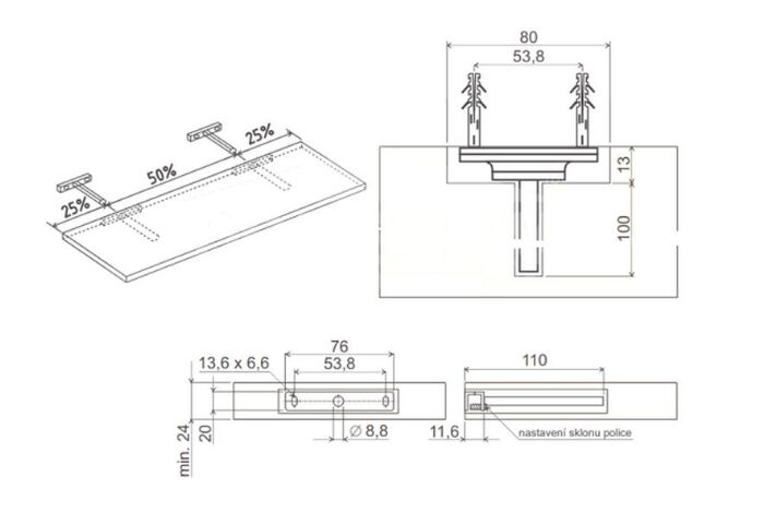 - max. zatížení 9 kg (včetně police) při použití 2 držáků