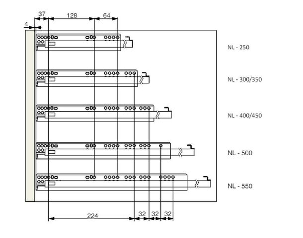 - délka vysunutí je stejná, jako je délka výsuvu (jedná se o celovýsuv)
