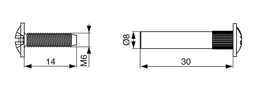 Spojovací šroub a pouzdro, se závitem M6, délka 14mm, křížová drážka PZ2 a plochá drážka