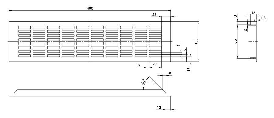 - Hliníková větrací mřížka, 100x400 mm, eloxovaný hliník