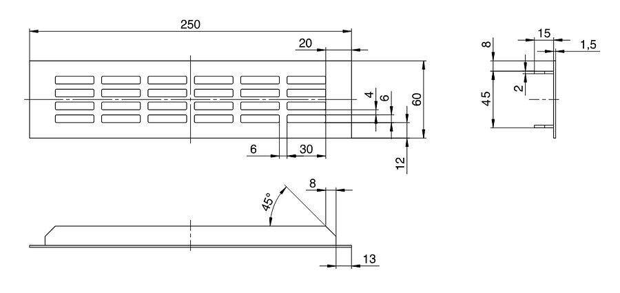 - Hliníková větrací mřížka, 60x250 mm, eloxovaný hliník
