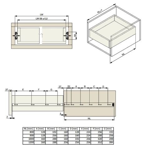 Jedná se o masivní výsuv, tloušťky použitých materiálů jsou 2.0, 2.0 a 2.2mm. Výsuv má gumový dorazový prvek, který přidržuje výsuv v zavřené poloze.