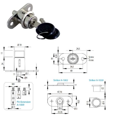 Zámek pro uzamykání posuvných dveří umístěných proti sobě. V případě nutnosti použití prodlužovacích čepů A-1009, možnost přiobjednání viz.