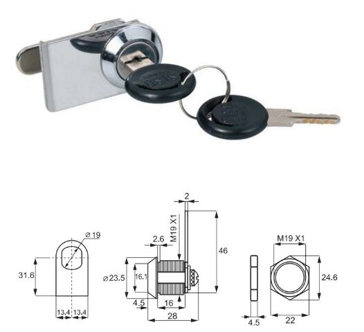 Zámek slouží k uzamykání jednoho skleněného křídla dveří do korpusu. Nutno vrtat otvor do skla.