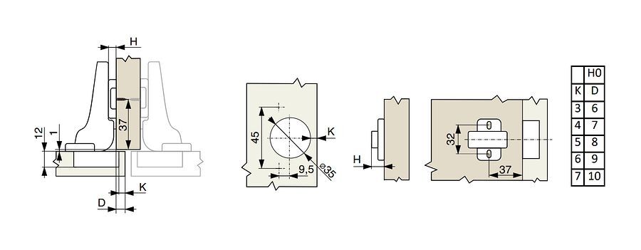 - sada nábytkového miskového závěsu s tlumením pro polonaložené dveře s montážní podložkou H0