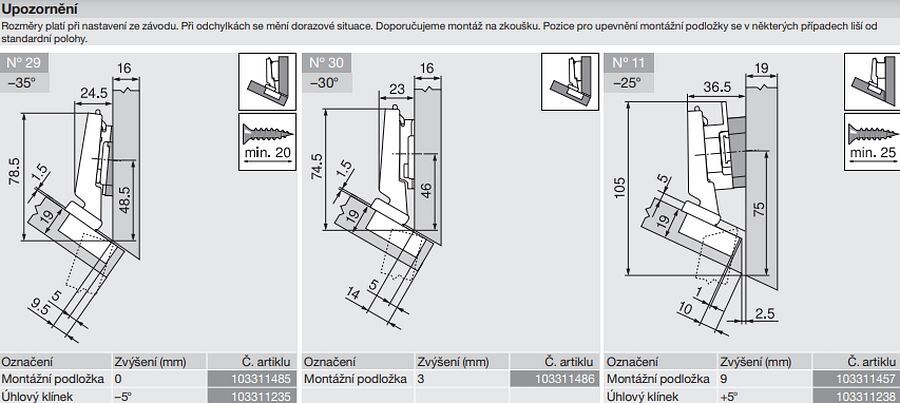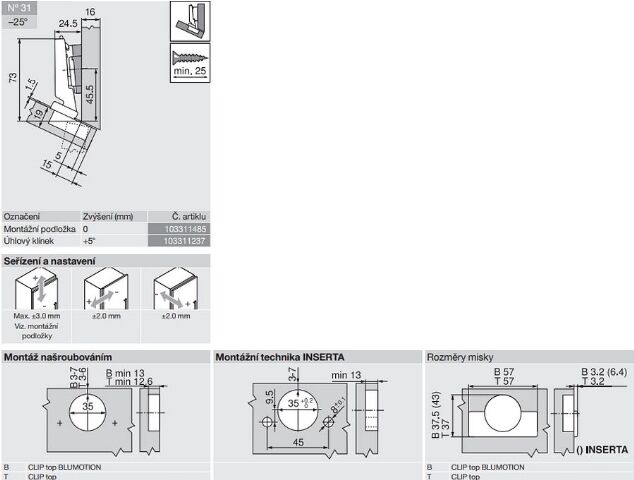 Nutno doobjednat montážní podložku CLIP základní podložky: ostatní viz. katalog Blum