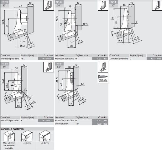 Nutno doobjednat montážní podložku CLIP základní podložky: ostatní viz. katalog Blum
