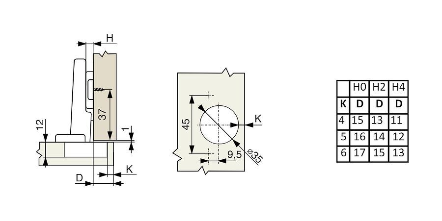 - v ramínku závěsu je zapuštěný kulatý excentrický šroub s velkým rozsahem pro snadné seřízení mezery mezi korpusem a dvířky