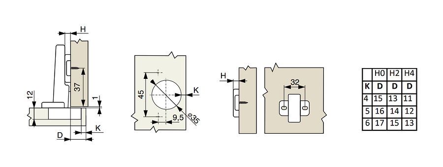 Sada nábytkového miskového závěsu pro naložené dveře, montážní podložky H0 s excentrem pro seřízení výšky dveří.